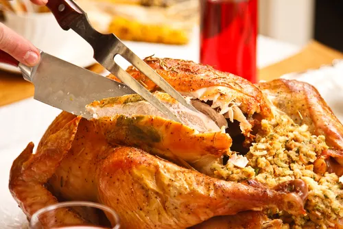 Αν κοκκινήσουν πολύ τα πόδια ή ο λαιμός, σκεπάζουμε με ασημόχαρτο το οποίο αφαιρούμε λίγο πριν τελειώσει το ψήσιμο.