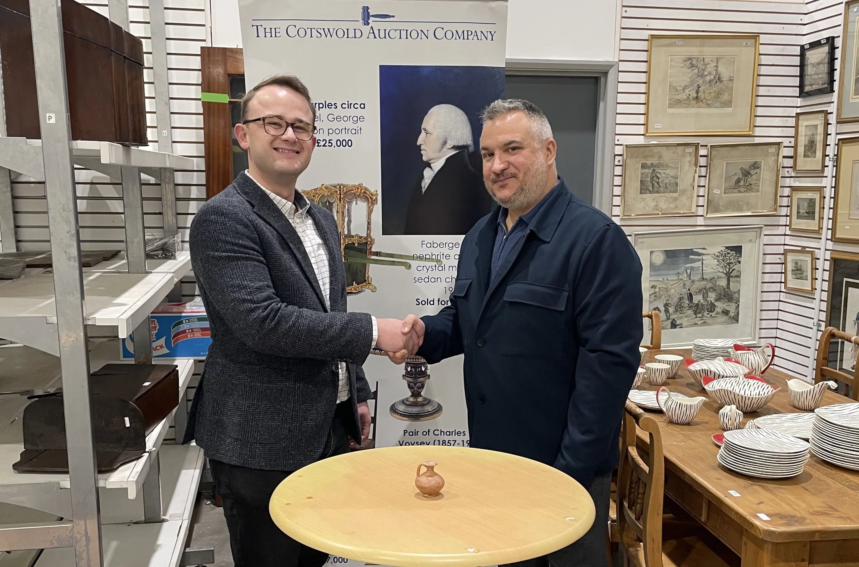 Ο Niall Fry, Auctioneer/Valuer της Cotswold Auction Company, μαζί με συναδέλφους του, υποδέχθηκαν την κυπριακή αποστολή και παρέδωσαν το αντικείμενο, σημειώνοντας την προσήλωση της εταιρείας στην ορθή συνεργασία και τον σεβασμό προς την πολιτιστική κληρονομιά.