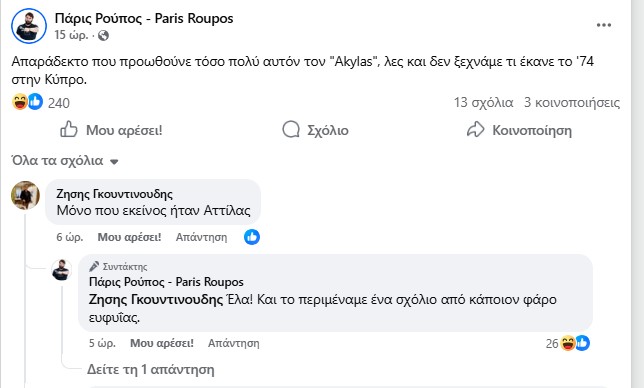 Ουσιαστικά σε μια φτηνή προσπάθεια, ο Ρούπος κάνει λογοπαίχνιο με το Αττίλας-Akylas έγραψε «Απαράδεκτο που προωθούνε τόσο πολύ αυτόν τον "Akylas", λες και δεν ξεχνάμε τι έκανε το '74 στην Κύπρο.»