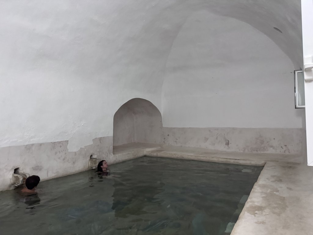 Λίγη ξεκούραση και ο οδηγός μας, ο Θοδωρής, μάς περίμενε για να μας οδηγήσει στην ιαματική πηγή «Θέρμα», στην οποία, σύμφωνα με την παράδοση, λούζονταν οι αρχαίες Λέσβιες όταν διοργάνωναν τα καλλιστεία τους στον γειτονικό ναό της Ήρας. Τα λουτρά, ανάμεσα σε κατάφυτους από ελαιόδεντρα λοφίσκους με απρόσκοπτη θέα προς τον κόλπο της Γέρας, χτίστηκαν την εποχή της Τουρκοκρατίας και διατηρούν μέχρι σήμερα την ανατολίτική τους αρχιτεκτονική. Το ιαματικό νερό εκβάλλει από τα έγκατα της γης σε βάθος 2.500 μέτρων και –αγνό, χωρίς καμία πρόσμειξη– καταλήγει σε δύο ομαδικούς, θολωτούς λουτήρες, ξεχωριστούς για άνδρες και γυναίκες. Η εμπειρία, την οποία βιώσαμε κι εμείς, κάνοντας μπάνιο στο λουτρό, είναι εξαγνιστική – σχεδόν, μυσταγωγική.
