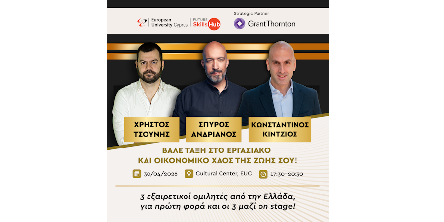 Το Future Skills Hub του European University Cyprus, σε συνεργασία με την Grant Thornton Κύπρου, στρατηγικό συνεργάτη, διοργανώνει την Πέμπτη, 30 Απριλίου 2026, ένα ξεχωριστό Live Q&A Session, φέρνοντας για πρώτη φορά στην Κύπρο, και για πρώτη φορά μαζί στην ίδια σκηνή, τρεις από τις πιο αναγνωρίσιμες προσωπικότητες της Ελλάδας στον χώρο της προσωπικής και επαγγελματικής ανάπτυξης: τον Χρήστο Τσούνη, τον Σπύρο Ανδριανό και τον Κωνσταντίνο Κίντζιο.