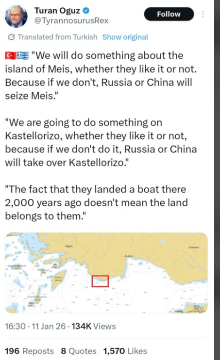 Παράλληλα ο αναλυτής Turan Oguz, μέσω ανάρτησής του στα μέσα κοινωνικής δικτύωση υποστηρίζει ότι «η Τουρκία θα κάνει κάτι για το νησί Μεσίγστη, είτε τους αρέσει είτε όχι», επικαλούμενος τον ισχυρισμό του Τραμπ για Γροιλανδια ότι, σε αντίθετη περίπτωση, «η Ρωσία ή η Κίνα θα καταλάβουν το Καστελλόριζο».