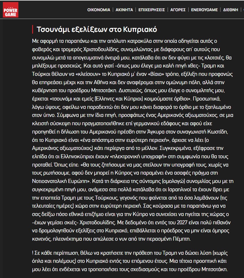 Ένα ύπουλο παραπολιτικό άρθρο δημοσίευσε χθες 12 Ιανουαρίου 2026 η στήλη Big Mouth της ελλαδικής ιστοσελίδας Power Game, το οποίο σκιαγραφεί ένα σκηνικό επιταχυνόμενων εξελίξεων στο Κυπριακό, με αναφορές σε παρασκηνιακές διεργασίες ΗΠΑ και Τουρκίας και σαφείς αιχμές για τον Πρόεδρο της Κυπριακής Δημοκρατίας Νίκο Χριστοδουλίδη για τον οποίο αναφέρει πως «άρχισε η αντίστροφη μέτρηση».