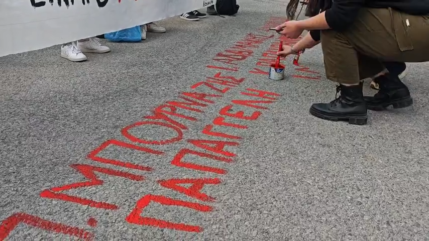 Ομάδα διαδηλωτών έγραψε στον δρόμο με κόκκινη μπογιά τα ονόματα των θυμάτων της τραγωδίας.