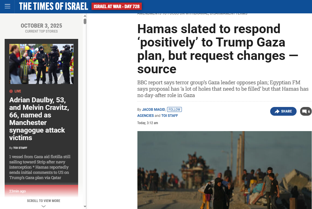 Αξιωματούχος της Χαμάς δήλωσε σήμερα στο Γαλλικό Πρακτορείο ότι η ισλαμιστική οργάνωση χρειάζεται ακόμα χρόνο για να εξετάσει το ειρηνευτικό σχέδιο για τη Γάζα που πρότεινε ο Αμερικανός πρόεδρος Ντόναλντ Τραμπ και ο Ισραηλινός πρωθυπουργός Μπενιαμίν Νετανιάχου δήλωσε ότι στηρίζει.