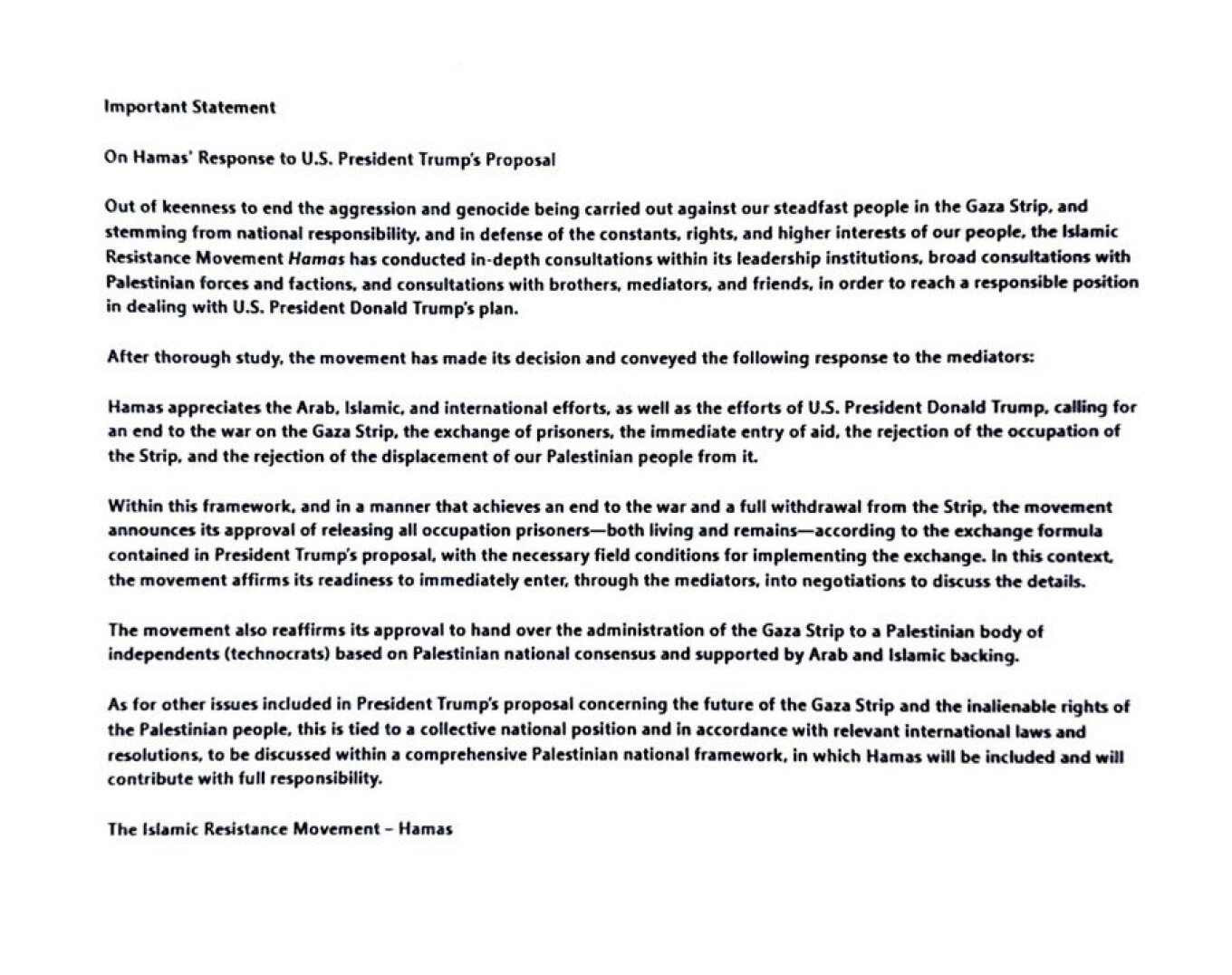 Στην ανακοίνωση - απάντηση στο σχέδιο Τραμπ η Χαμάς τονίζει ότι «εκτιμά τις αραβικές, ισλαμικές και διεθνείς προσπάθειες, καθώς και τις προσπάθειες του προέδρου των ΗΠΑ Ντόναλντ Τραμπ, που ζητούν τον τερματισμό του πολέμου στη Λωρίδα της Γάζας, την ανταλλαγή των κρατουμένων και την άμεση είσοδο βοήθειας» στον θύλακα. Προσθέτει ότι εγκρίνει «την απελευθέρωση όλων των αιχμαλώτων της κατοχής –ζωντανών και λειψάνων– σύμφωνα με το σχέδιο ανταλλαγής (σ.σ. με Παλαιστίνιους κρατουμένους) που περιλαμβάνεται στην πρόταση του Τραμπ, υπό τις αναγκαίες συνθήκες επί του πεδίου για την υλοποίησή της».
