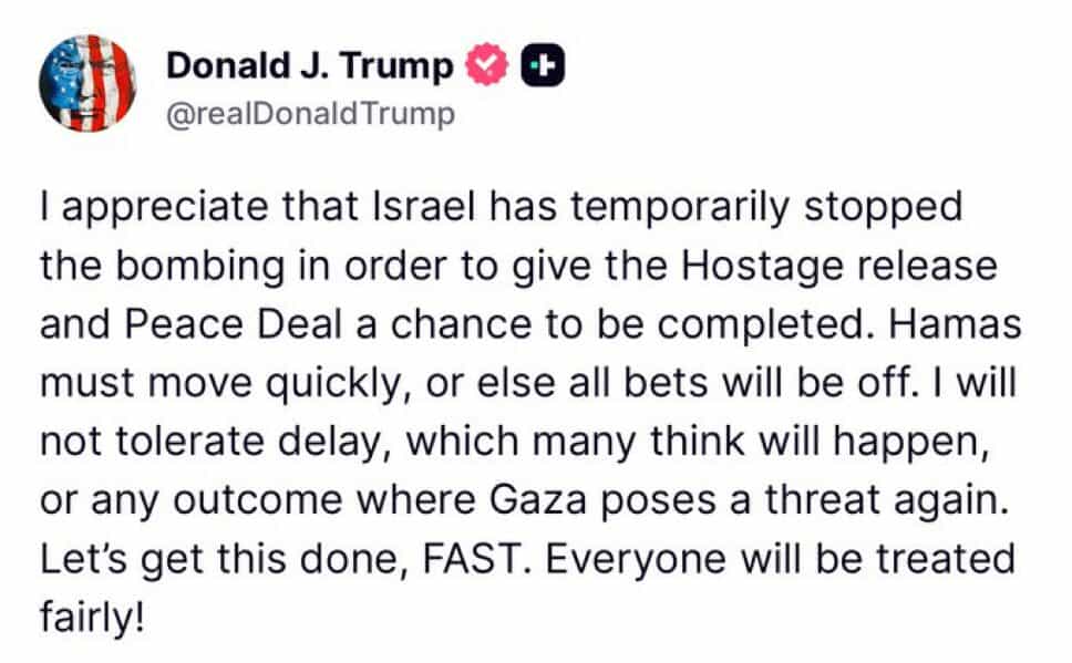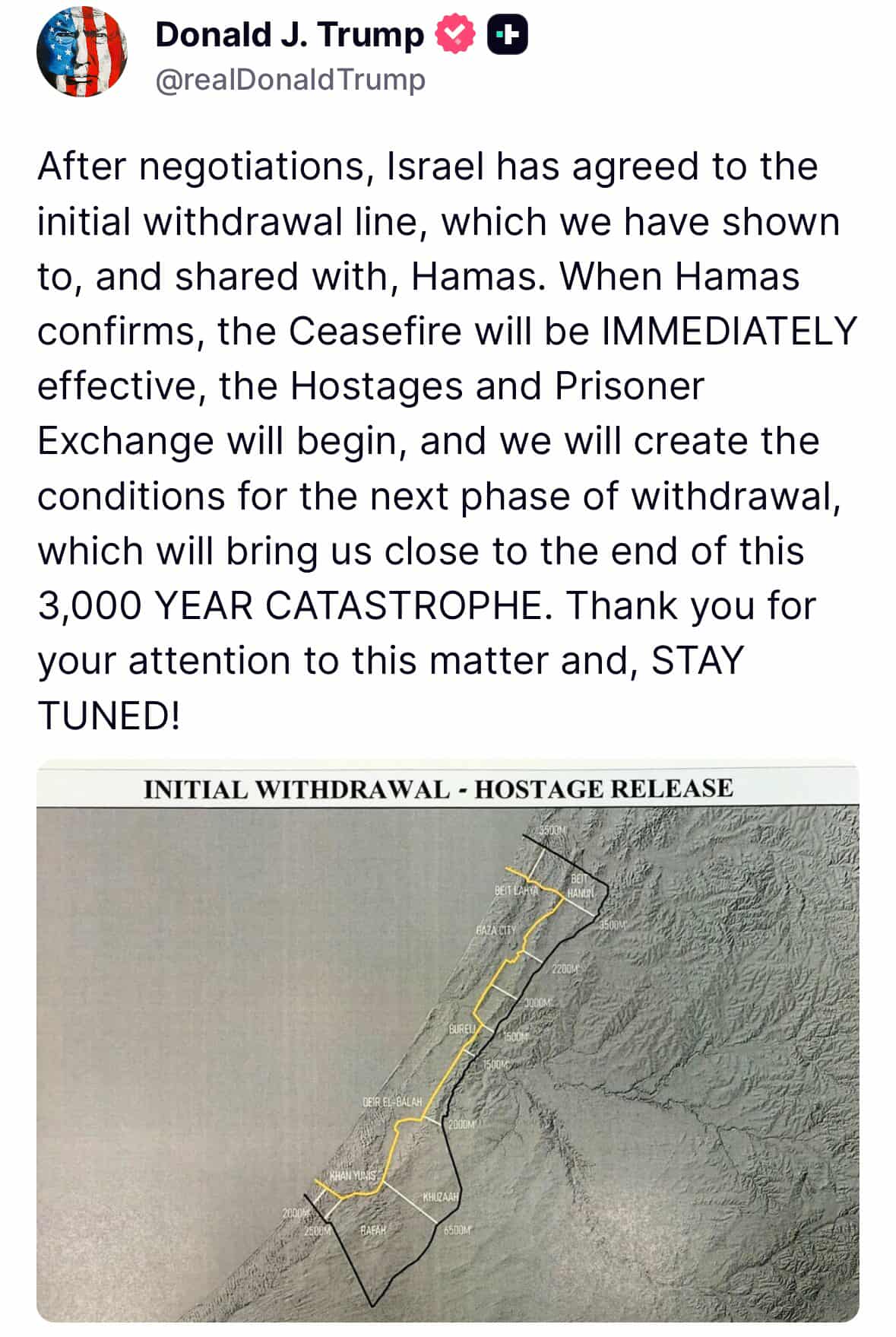 Ο πρόεδρος των ΗΠΑ ανέφερε ότι το Ισραήλ έχει «συμφωνήσει στη γραμμή αρχικής αποχώρησης» και ότι «όταν η Χαμάς επιβεβαιώσει», θα ξεκινήσει η κατάπαυση του πυρός, θα απελευθερωθούν οι Ισραηλινοί όμηροι και θα αρχίσει η ανταλλαγή κρατουμένων.