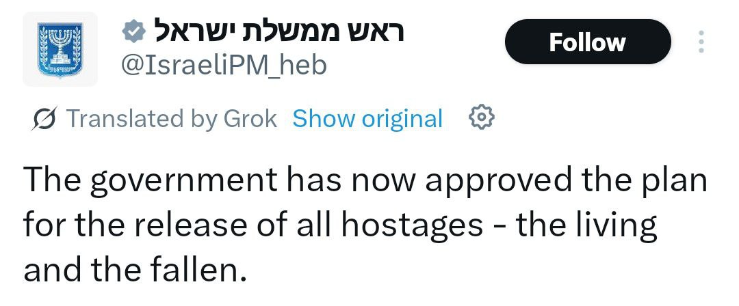 «Η κυβέρνηση μόλις ενέκρινε το πλαίσιο για την απελευθέρωση όλων των ομήρων — των ζωντανών και των αποβιωσάντων», ανέφερε το γραφείο του πρωθυπουργού του Ισραήλ μέσω X. Η εξέλιξη αυτή επιτρέπει να τεθεί σε ισχύ η συμφωνία.