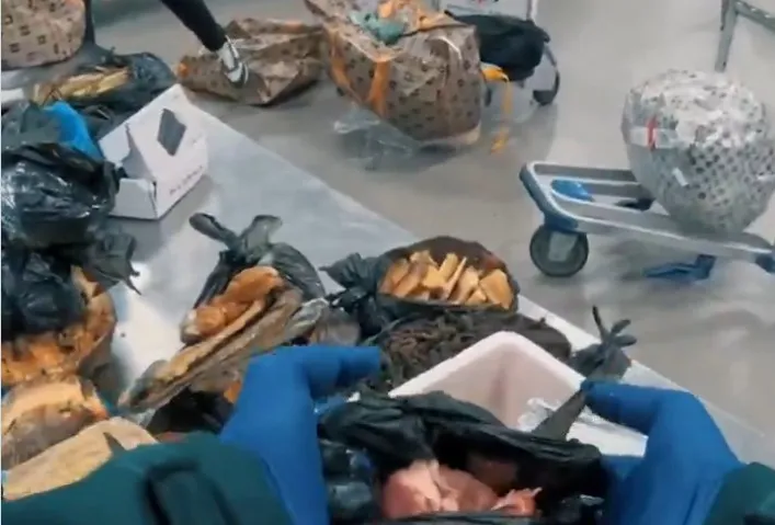 Σύμφωνα με βίντεο που δημοσιεύτηκε, η επιθεώρηση των αποσκευών αποκάλυψε μια σειρά από επικίνδυνα προϊόντα που παραβιάζουν τους υγειονομικούς κανονισμούς. Οι τελωνειακοί, φορώντας γάντια και μάσκες, άνοιξαν τις βαλίτσες και βρήκαν πακέτα με ωμό κρέας που σάπιζε και σέρνονταν από έντομα, ξεραμένα ψάρια και κρέατα που εκπέμπουν έντονη οσμή, καθώς και σακούλες με αποξηραμένα έντομα – πιθανώς μέρος της τοπικής διατροφής στο Κονγκό, αλλά απαγορευμένα λόγω κινδύνου για τη δημόσια υγεία.