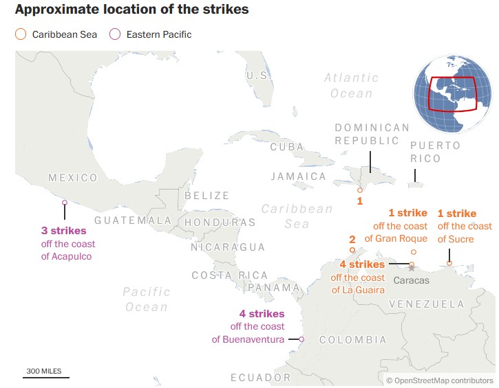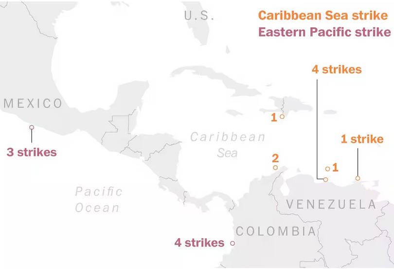 Από τον Σεπτέμβριο, η Ουάσιγκτον έχει πραγματοποιήσει 19 επιθέσεις εναντίον ταχύπλοων σκαφών, δέκα στην Καραϊβική και εννέα στον ανατολικό Ειρηνικό, με συνολικό απολογισμό 76 νεκρούς, δύο συλληφθέντες και έναν αγνοούμενο. Ο υπουργός Άμυνας Πιτ Χέγκσεθ χαρακτήρισε τους στόχους «ναρκοτρομοκράτες που έχουν προκαλέσει περισσότερους θανάτους Αμερικανών από την Αλ Κάιντα».