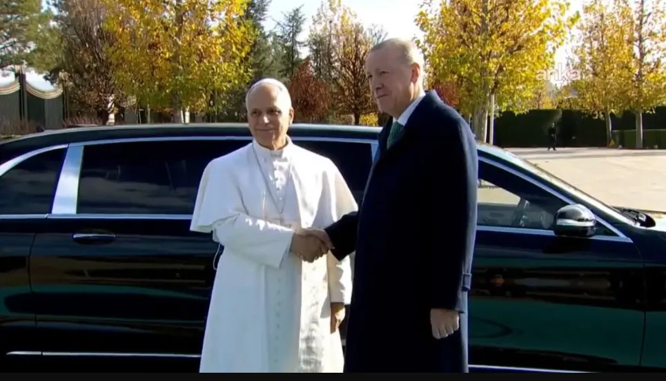 Ο Πάπας Λέων ΙΔ΄ συναντήθηκε πριν από λίγο με τον Πρόεδρο της Τουρκίας Ρετζέπ Ταγίπ Ερντογάν. Η συνάντηση πραγματοποιήθηκε στο Προεδρικό Συγκρότημα , αμέσως μετά την άφιξη του Πάπα στην Άγκυρα, αποτελώντας τον πρώτο σταθμό του επίσημου προγράμματος της επίσκεψής του.