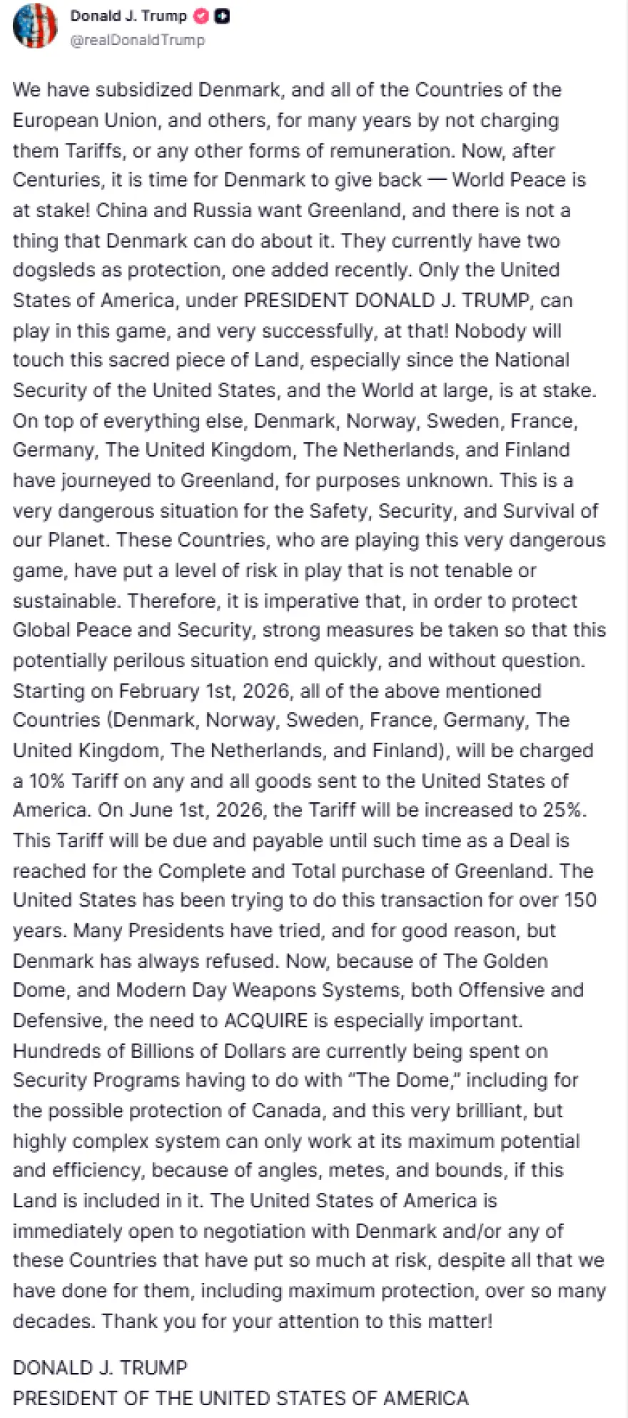Ο δασμός αυτός θα είναι απαιτητός και πληρωτέος έως ότου επιτευχθεί συμφωνία για την πλήρη και ολική αγορά της Γροιλανδίας. Οι Ηνωμένες Πολιτείες προσπαθούν να πραγματοποιήσουν αυτή τη συναλλαγή για πάνω από 150 χρόνια. Πολλοί πρόεδροι έχουν προσπαθήσει, και για καλό λόγο, αλλά η Δανία πάντα αρνιόταν.