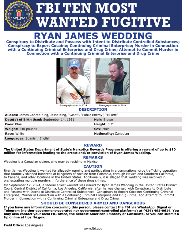 Ο 44χρονος Καναδός καταζητούνταν από το FBI με κατηγορίες ότι διηύθυνε μια εγκληματική οργάνωση υπεύθυνη για τη μεταφορά περίπου 60 τόνων κοκαΐνης ετησίως στο Λος Άντζελες μέσω φορτηγών από το Μεξικό. Ο Ράιαν Γουέντινγκ ήταν από τον Μάρτιο στην λίστα των δέκα πιο καταζητούμενων φυγάδων, με το FBI να προσφέρει 15 εκατομμύρια δολάρια για πληροφορίες που θα οδηγούσαν στη σύλληψη ή την καταδίκη του.