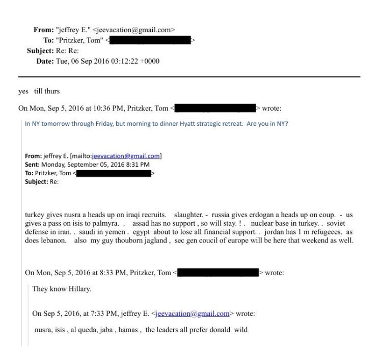 Ιδιαίτερο ενδιαφέρον παρουσιάζει αλληλογραφία της 5ης Σεπτεμβρίου 2016 με παραλήπτη τον Tom Pritzker, όπου ο Epstein γράφει, μεταξύ άλλων, ότι «η Ρωσία έδωσε στον Erdogan προειδοποίηση για το πραξικόπημα». Ο ισχυρισμός αυτός συνάδει με δημοσιεύματα της εποχής, σύμφωνα με τα οποία η Μόσχα είχε μεταφέρει πληροφορίες στην Άγκυρα πριν από την απόπειρα της 15ης Ιουλίου 2016. Ωστόσο, τα email δεν τεκμηριώνουν περαιτέρω το περιεχόμενο ή την πηγή αυτής της πληροφόρησης.