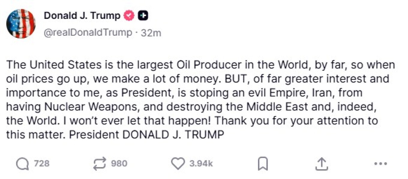 Οι Ηνωμένες Πολιτείες αποτελούν μακράν τον μεγαλύτερο παραγωγό πετρελαίου παγκοσμίως και, ως εκ τούτου, επωφελούνται οικονομικά όταν οι διεθνείς τιμές της ενέργειας αυξάνονται, σημείωσε σε σημερινή του ανάρτησή στο Truth Social ο πρόεδρος των ΗΠΑ, Ντόναλντ Τραμπ.