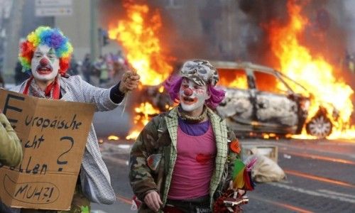 Στην περιοχή της παλιάς όπερας της Φρανκφούρτης, διαδηλωτές πέταξαν πέτρες στους αστυνομικούς, ένας από τους οποίους τραυματίσθηκε, όπως ανακοίνωσε εκπρόσωπος της αστυνομίας, σύμφωνα με το Γερμανικό Πρακτορείο Ειδήσεων (DPA). Κάδοι απορριμμάτων και αυτοκίνητα πυρπολήθηκαν κατά τη διάρκεια της νύκτας.