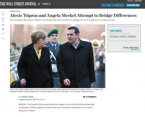 Στη Νιου Γιορκ Τάιμς επισημαίνεται, μεταξύ άλλων, ότι "με τον χρόνο να πιέζει ασφυκτικά για το πρόβλημα ρευστότητας της Ελλάδας, οι δύο ηγέτες συναντήθηκαν σε μια προσπάθεια εξομάλυνσης των σχέσεων των δύο χωρών". Στην ανταπόκριση γίνεται αναφορά και στις δηλώσεις του Κυβερνητικού Εκπροσώπου της Ελλάδας Γαβριήλ Σακελλαρίδη για την επιστολή του Έλληνα Πρωθυπουργού προς την κ. Μέρκελ στις 15 Μαρτίου, την οποία αποκάλυψε η εφημερίδα Φαϊνάνσιαλ Τάιμς.