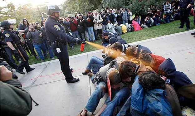 Κάποιοι σπουδαστές έκαναν καθιστική διαμαρτυρία και η ελληνικής καταγωγής πρύτανης, Λίντα Κατέχη, κάλεσε την αστυνομία. Ενας αστυνομικός ψέκασε χωρίς να δεχτεί καμία πρόκληση με το σπρέι πιπεριού τους διαμαρτυρόμενους και τα βίντεο από την αυθαίρετη και βίαιη πράξη του έκαναν το γύρο του κόσμου μέσω του Διαδικτύου.