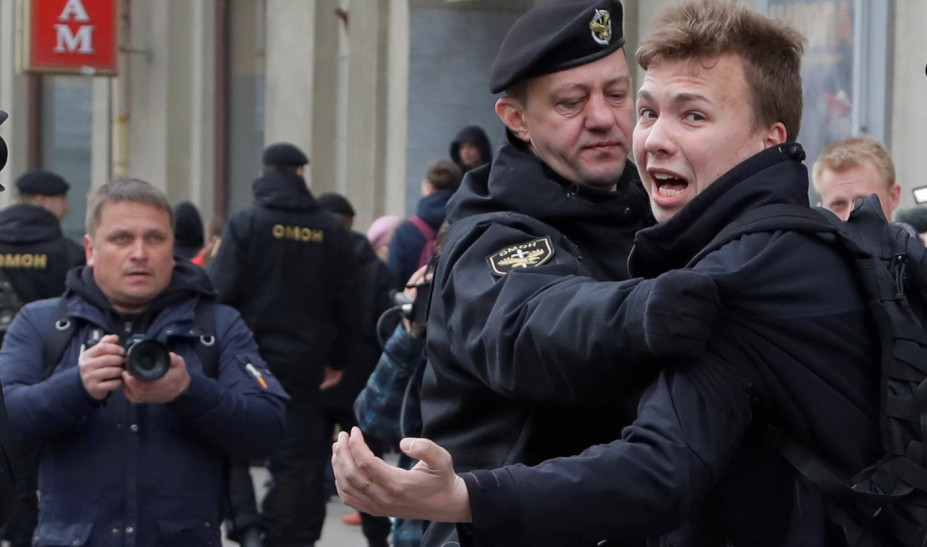 Ο μπλόγκερ που έχει την έδρα του στη Λιθουανία και η σύντροφός του Σοφία Σαπέγκα συνελήφθησαν αφού την Κυριακή η Λευκορωσία έστειλε ένα μαχητικό αεροσκάφος για να αναχαιτίσει πτήση της Ryanair με προορισμό το Βίλνιους, η οποία τελικά προσγειώθηκε στο Μινσκ.
