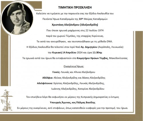 Τα οστά ενός ακόμη ήρωα της 33ης Μοίρας Καταδρομών ταυτοποιήθηκαν με τη μέθοδο του DNA. Πρόκειται για τον καταδρομέα Χριστάκη Αλεξάνδρου ο οποίος γεννήθηκε στη Λευκωσία στις 11 Ιουνίου του 1954.