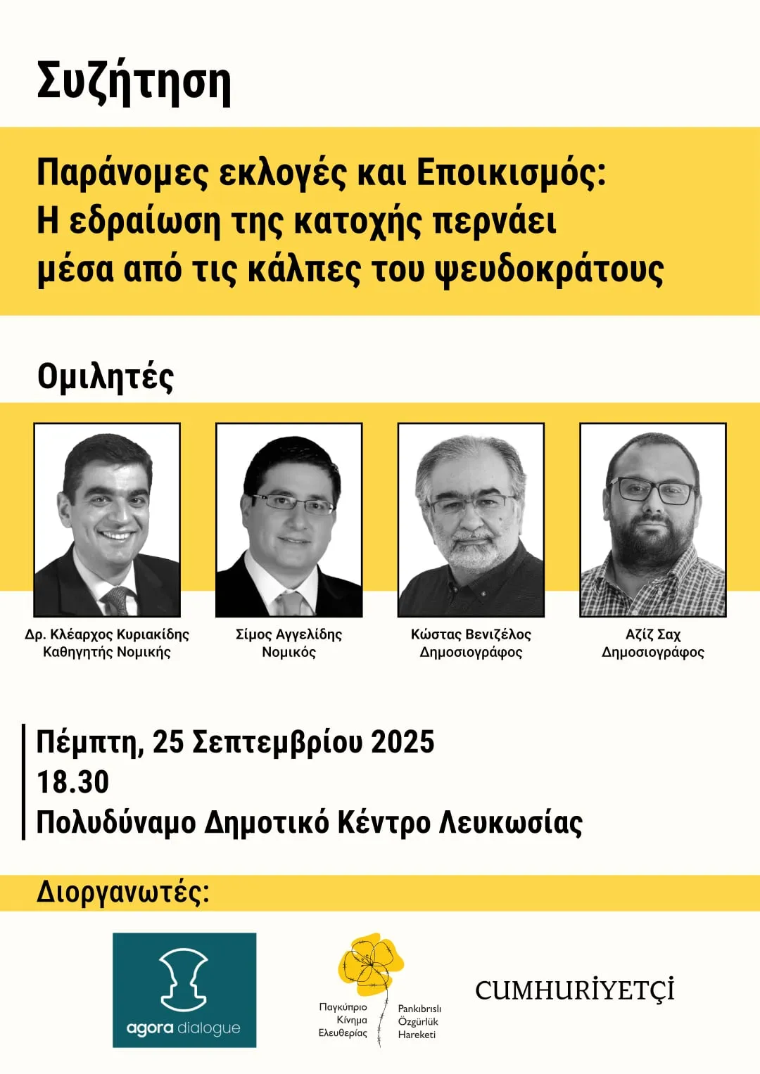 Με τίτλο «Παράνομες εκλογές και Εποικισμός: Η εδραίωση της κατοχής περνάει μέσα από τις κάλπες του ψευδοκράτους», πραγματοποιείται την Πέμπτη 25 Σεπτεμβρίου 2025, στις 18:30, στο Πολυδύναμο Δημοτικό Κέντρο Λευκωσίας, συζήτηση με τη συμμετοχή διακεκριμένων πανεπιστημιακών και δημοσιογράφων.