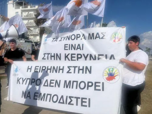 Περίπου 100 μαθητές σχολείων Μέσης και Τεχνικής Εκπαίδευσης στη Λάρνακα, πραγματοποίησαν σήμερα εκδήλωση καταδίκης του ψευδοκράτους και μνήμης και τιμής του Πολυτεχνείου, στη λεωφόρο Αθηνών στη παραλία των Φοινικούδων.