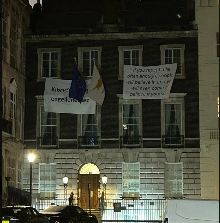 Παρόντες στο σημείο ήταν και αστυνομικοί, οι οποίοι, σύμφωνα με τις ίδιες πληροφορίες, ζήτησαν από τον πρέσβη να απομακρύνει το πανό. Ωστόσο, εκείνος φέρεται να αρνήθηκε, υποστηρίζοντας ότι το κτήριο της Ύπατης Αρμοστείας αποτελεί κυρίαρχο έδαφος και δεν υπόκειται σε παρέμβαση των βρετανικών αρχών.
