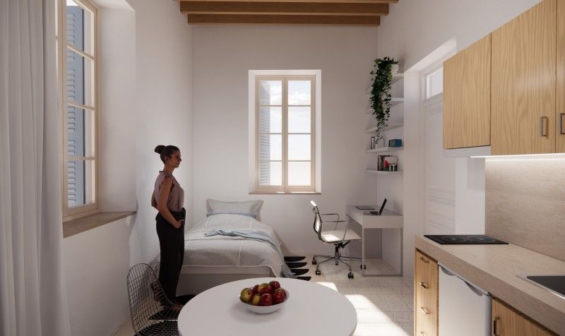 Πρόκειται για έργο που θα περιλαμβάνει 50 δωμάτια, από τα οποία το ένα πληροί τα πρότυπα σχεδιασμού για ΑμεΑ. Το κάθε δωμάτιο θα είναι εξοπλισμένο με μονόπορτο ψυγείο, φούρνο μικροκυμάτων, διπλή ηλεκτρική εστία, απορροφητήρα και κλιματιστικό θέρμανσης/ ψύξης. Επιπλέον θα δημιουργηθούν δύο δωμάτια/ πλυσταριά με 12 πλυντήρια ρούχων και 12 στεγνωτήρια.