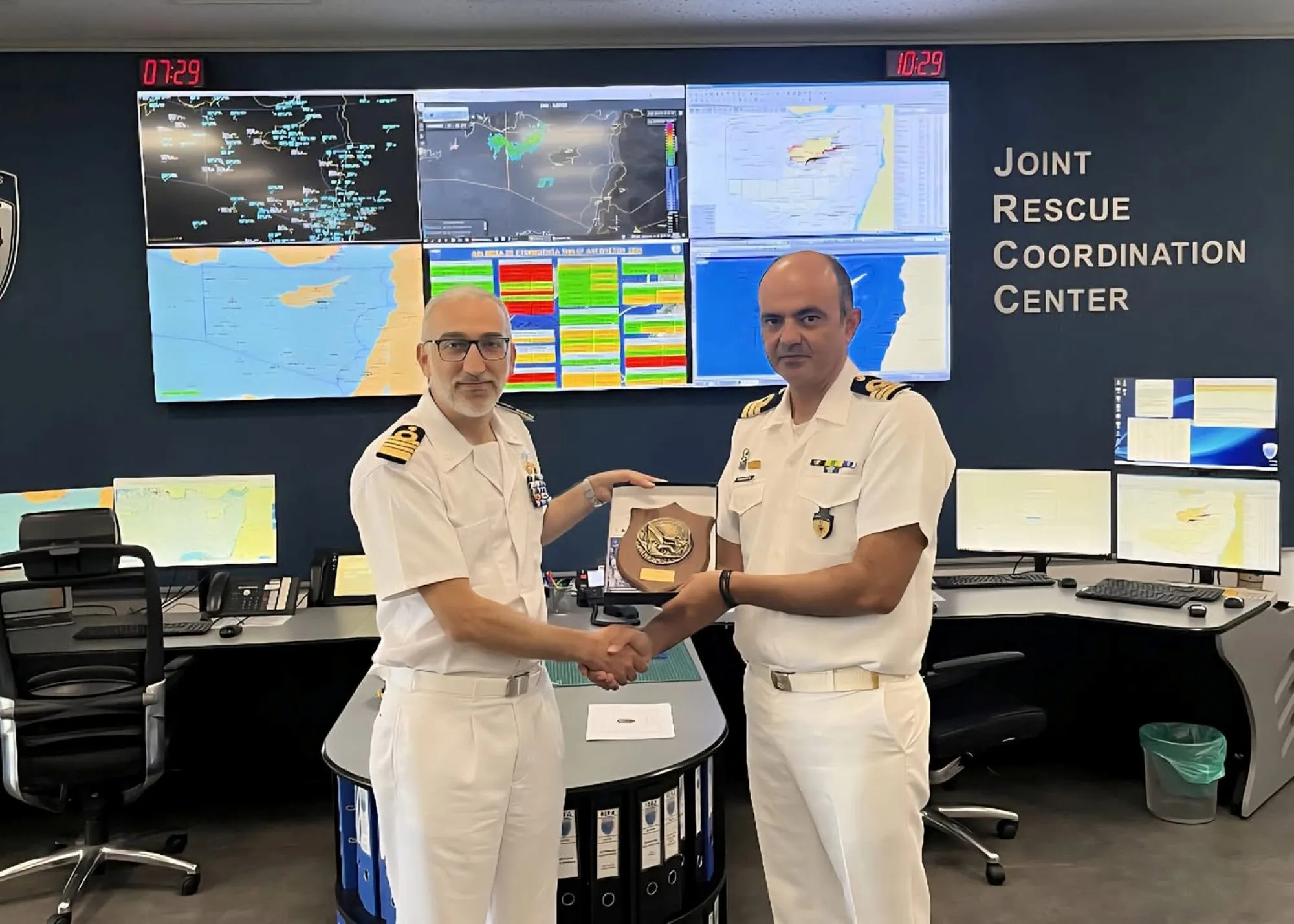 Ενημερωτική επίσκεψη στο Κέντρο Συντονισμού Έρευνας και Διάσωσης (ΚΣΕΔ), στη Λάρνακα, πραγματοποίησαν σήμερα ο Κυβερνήτης και μέρος του πληρώματος του ιταλικού καταδρομικού "Francesco Mimbelli" μαζί με σπουδαστές της Ναυτικής Σχολής Υπαξιωματικών της Ιταλίας.