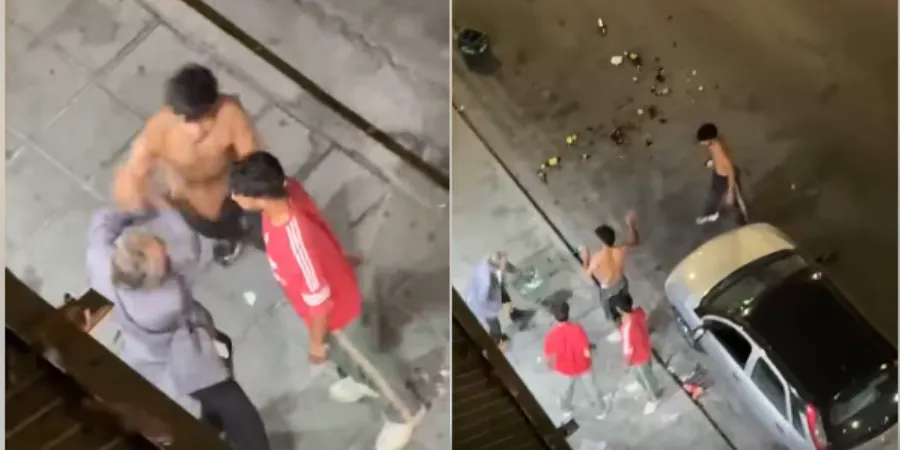 Στη συνέχεια ο ηλικιωμένος αρπάζει ένα κιβώτιο με μπύρες και το πετά στον νεαρό, με τον νεαρό να παίρνει μια μπύρα και να χτυπά πισώπλατα τον ηλικιωμένο.