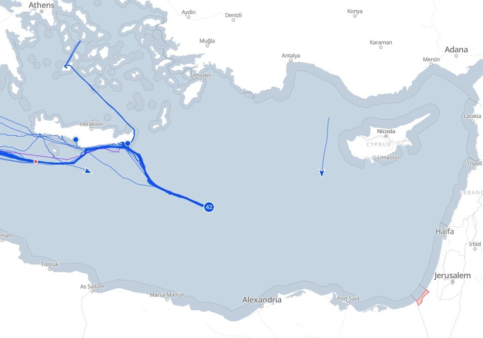 Χαρτες παρακολούθησης της νηοπομπής δείχνουν τα πλοία ανάμεσα σε Κύπρο και Κρήτη.