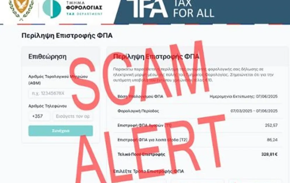 Σύμφωνα με την καταγγελία, που υποβλήθηκε στο ΤΑΕ, πολίτης έλαβε χθες 29 Σεπτεμβρίου, μήνυμα ηλεκτρονικού ταχυδρομείου – e-mail, το οποίο ψευδώς εμφανιζόταν να προέρχεται από το Τμήμα Φορολογίας και στο οποίο γινόταν αναφορά για επιστροφή φόρου ΦΠΑ.