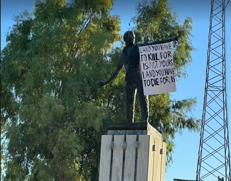 Ένα σύνθημα που συνήθως εμφανίζεται σε φιλο-Παλαιστινιακές διαδηλώσεις εντοπίστηκε κρεμασμένο στο άγαλμα του ήρωα Μάρκου Δράκου της ΕΟΚΑ στο κέντρο της Λευκωσίας.