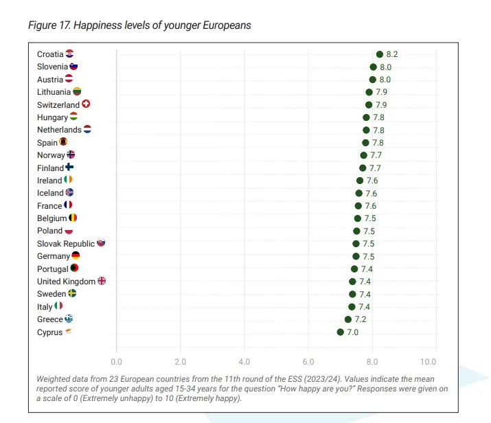 Στο πιο θετικό άκρο της κλίμακας, ορισμένες χώρες της Κεντρικής και Βόρειας Ευρώπης ξεχώρισαν με αξιοσημείωτα υψηλές βαθμολογίες ευτυχίας. Σε αυτές περιλαμβάνονταν η Αυστρία (8,0), η Σλοβενία (8,0) και η Κροατία (8,2) – η υψηλότερη μεταξύ όλων των χωρών που συμμετείχαν στην έρευνα. Ομοίως, οι νέοι στην Ολλανδία και την Ουγγαρία (και οι δύο 7,8) και η Ελβετία (7,9) ανέφεραν επίσης επίπεδα ευτυχίας άνω του μέσου όρου.