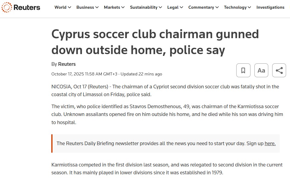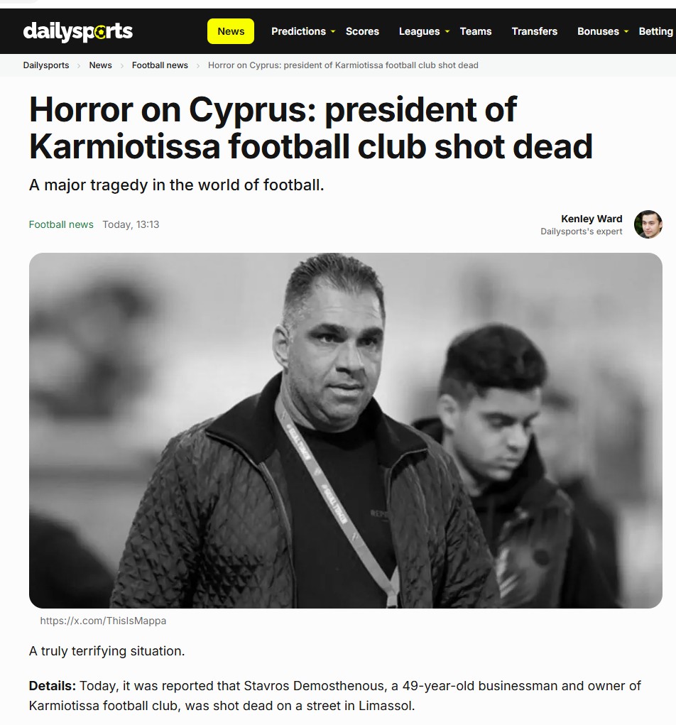 «Ο αμφιλεγόμενος επιχειρηματίας και πρόεδρος της κυπριακής ομάδας Καρμιώτισσα, Σταύρος Δημοσθένους, δολοφονήθηκε την Παρασκευή στη Λεμεσό, ύστερα από ένοπλη επίθεση έξω από το σπίτι του.Ο Δημοσθένους, που είχε κατηγορηθεί από την UEFA για εμπλοκή σε στημένα παιχνίδια, ήταν επίσης γνωστός ως ποδοσφαιρικός μάνατζερ. Οι δράστες διέφυγαν και πυρπόλησαν το βαν που χρησιμοποίησαν για τη δολοφονία», αναφέρει το δημοσίευμα.