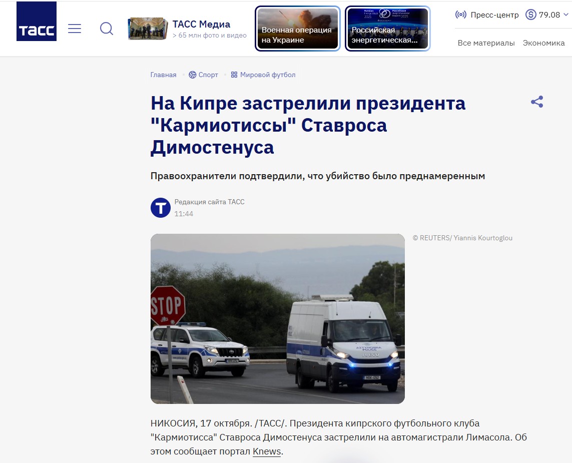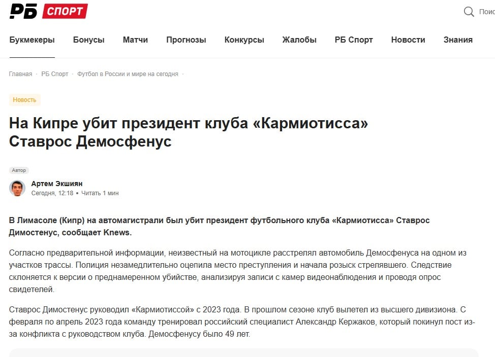 На Кипре убит президент клуба «Кармиотисса» Ставрос Демосфенус – он был застрелен сегодня утром в своей машине (ТАСС)