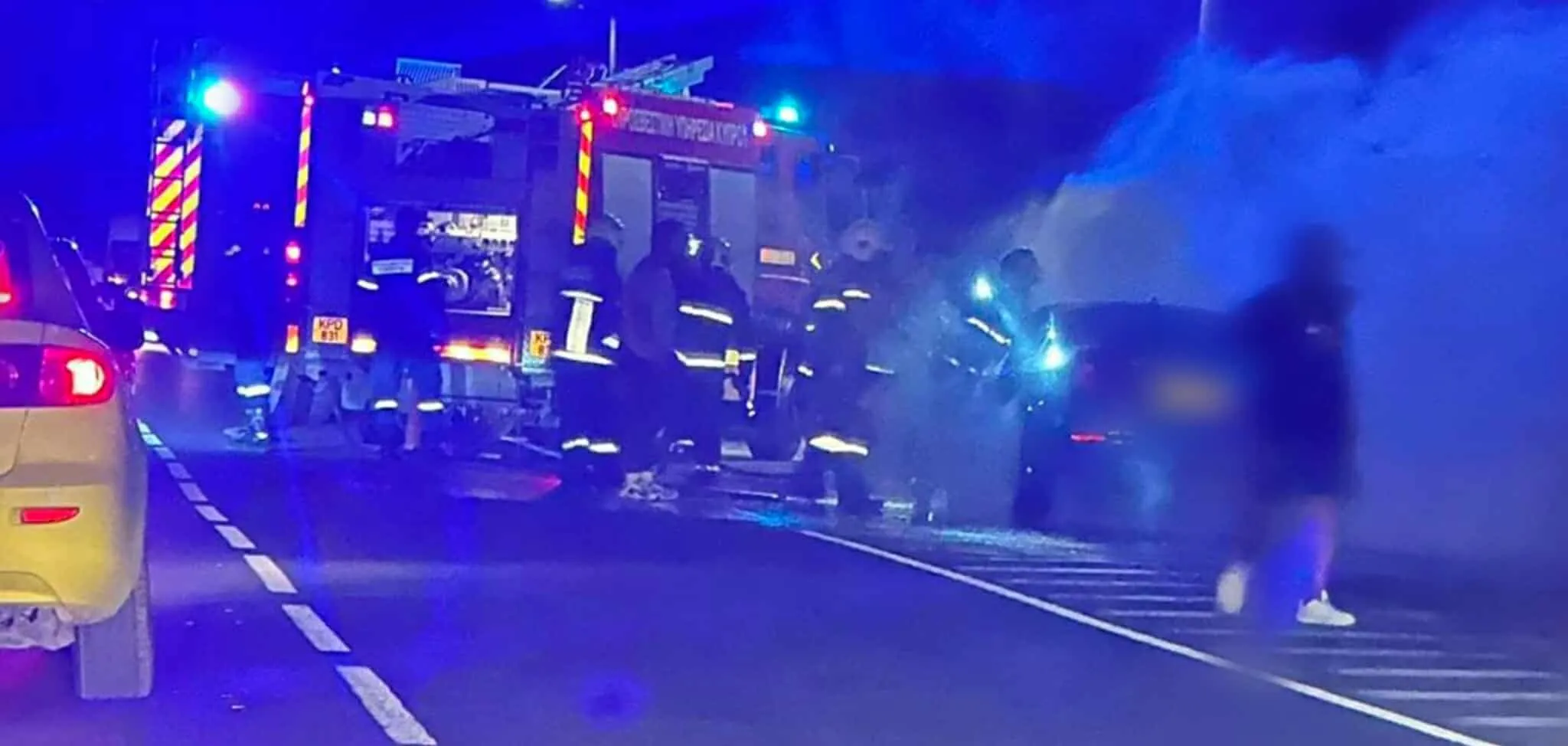 Η Αστυνομία βρίσκεται επίσης στο σημείο και ρυθμίζει την κυκλοφορία, ενώ διερευνώνται τα αίτια της πυρκαγιάς.