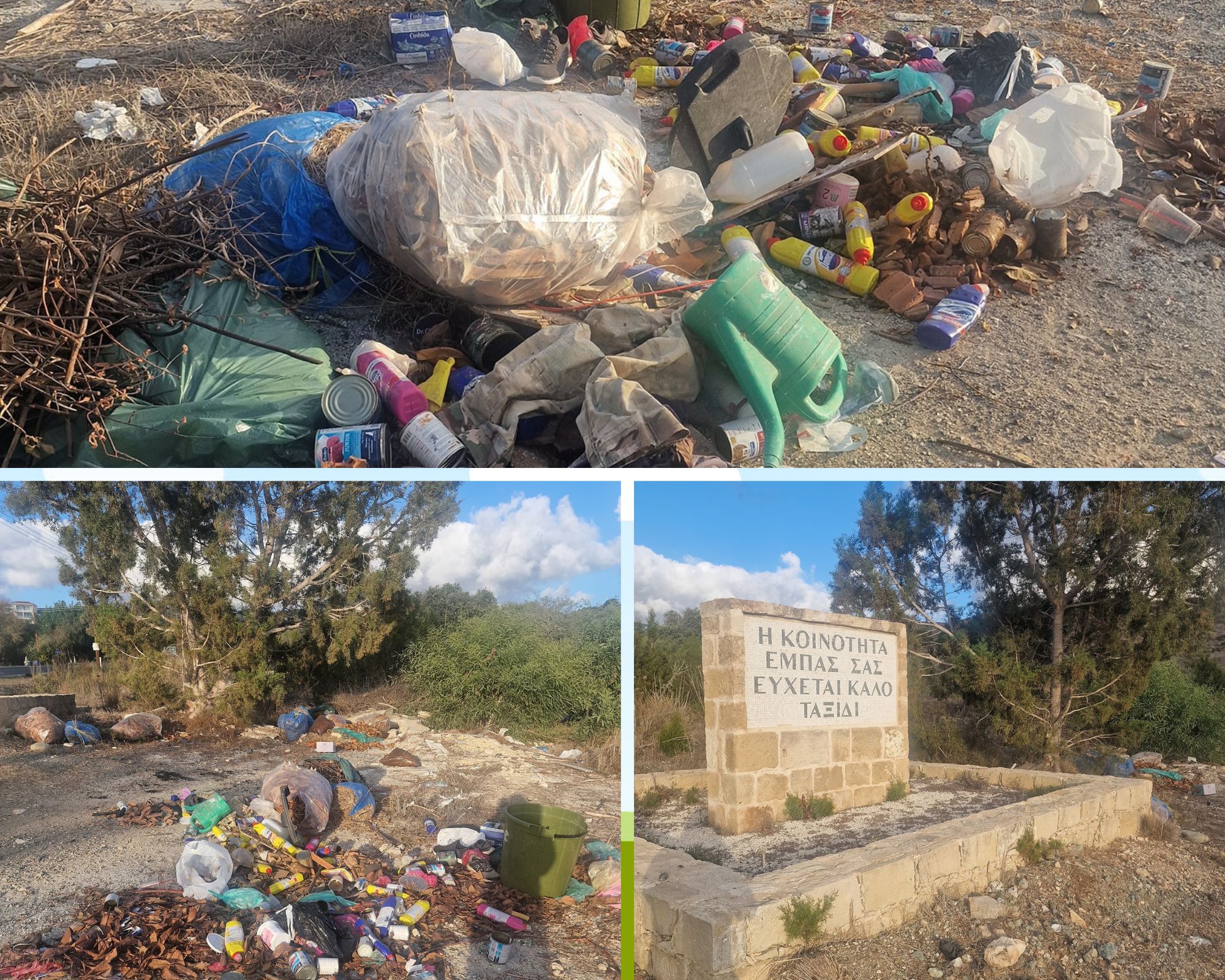 Συγκεκριμένα, με βάση την ανάρτηση της Κούλλας Κυριάκου στη σελίδα CY Police Checkpoints στο Facebook, ασυνείδητοι πέταξαν σκουπίδια, συμπεριλαμβανομένων σε αυτά μεγάλου αριθμού με συσκευασίες χλωρίνης.