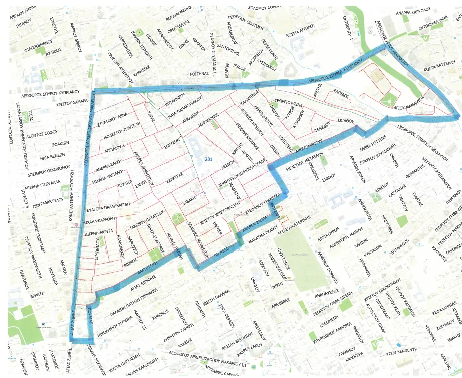 Από την περιοχή νότια της Λεωφόρου Σπύρου Κυπριανού (ανατολικά από την Λεωφόρο Αρχιεπισκόπου Μακαρίου I – δρόμος Μέσα Γειτονιάς μέχρι και δυτικά της Λεωφόρου Αγίου Αθανασίου) και η περιοχή βόρεια των οδών Πούλιας, Βαλτετσίου, Πικάσο, Ανδρέα Ζάππα, Μότσαρτ και Αριστομένους.