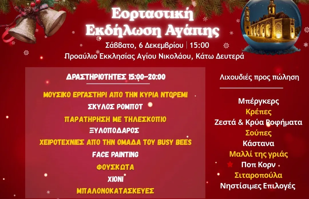 Η κοινότητα της Κάτω Δευτεράς ετοιμάζεται για μια ζεστή, εορταστική συνάντηση αγάπης, καθώς το Σάββατο 6 Δεκεμβρίου θα πραγματοποιηθεί στον προαύλιο χώρο της Εκκλησίας Αγίου Νικολάου μια ολοήμερη χριστουγεννιάτικη εκδήλωση με φιλανθρωπικό χαρακτήρα. Η πρωτοβουλία, που τελεί υπό την Παναγία Χρυσοσπηλιώτισσα, φιλοδοξεί να ενώσει μικρούς και μεγάλους σε μια ημέρα αφιερωμένη στη χαρά, στη δημιουργία και στην προσφορά.