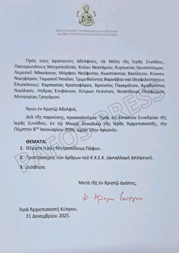 Στην επιστολή όπως φαίνεται πιο κάτω ο Μακαριώτατος ενημερώνει τα μέλη της Ιεράς Συνόδου για την αυριανή συνεδρίαση, πλην όμως του Τυχικού, με τον οποίο όπως δήλωσε σε συνέντευξή του χθες δεν υπάρχει καμία επικοινωνία.