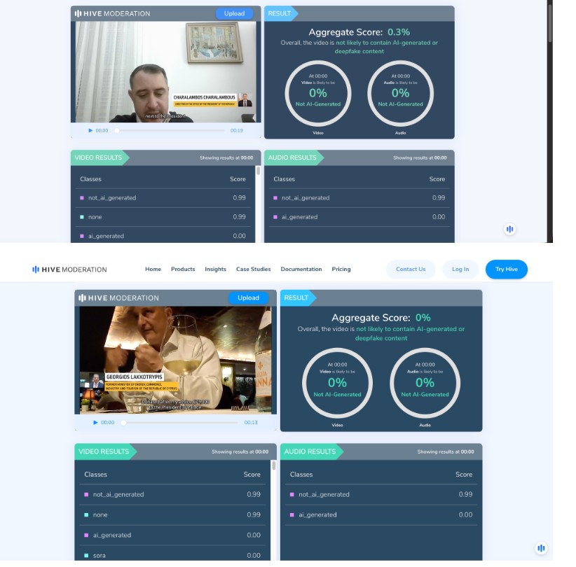 Στο πλαίσιο του fact-checking, πραγματοποιήθηκε τεχνική ανάλυση με εργαλεία ανίχνευσης ΑΙ και deepfake, συγκεκριμένα μέσω των πλατφορμών Hive Moderation και InVID-WeVerify. Οι έλεγχοι δεν ανέδειξαν σαφείς ή αξιόπιστες ενδείξεις ότι το υλικό έχει παραχθεί ή αλλοιωθεί με τεχνητή νοημοσύνη, ειδικά στα σημεία όπου εμφανίζονται πρόσωπα και ομιλία.