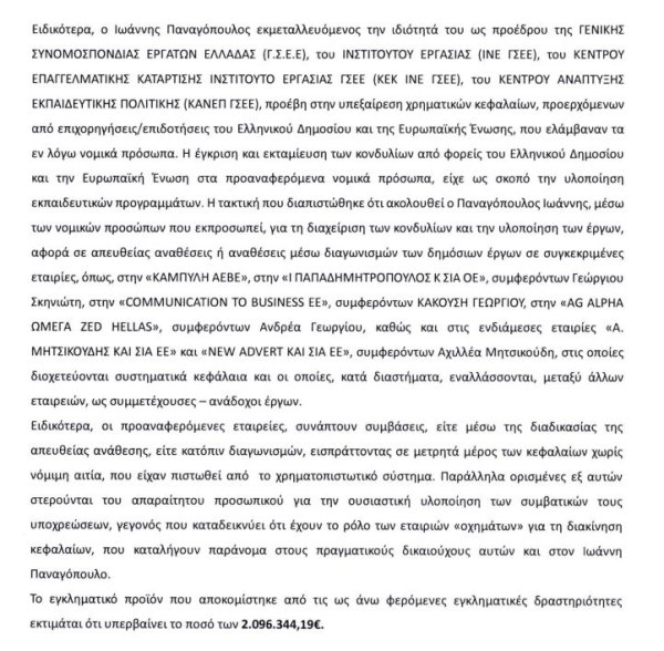 Πρόκειται για την υπόθεση του Προέδρου της ΓΣΕΕ, Γιάννης Παναγόπουλου, όπου ελέγχεται για διαδρομή χρήματος που φέρεται να ξεκινά από τα ταμεία της ΓΣΕΕ και να καταλήγει σε ιδιωτικούς λογαριασμούς.