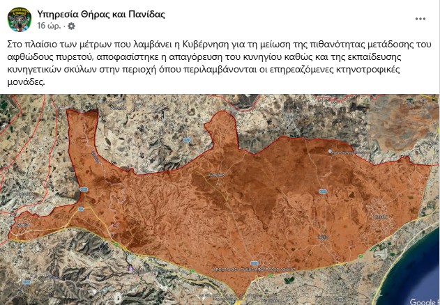 Σύμφωνα με την ανακοίνωση, η απαγόρευση αφορά τόσο το κυνήγι όσο και την εκπαίδευση κυνηγετικών σκύλων εντός της καθορισμένης ζώνης, όπου λειτουργούν οι κτηνοτροφικές μονάδες που επηρεάζονται από τα περιοριστικά μέτρα.