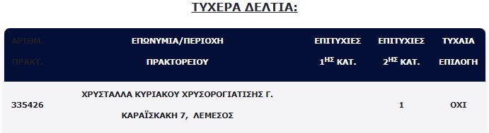 Επίσης, ένα τυχερό δελτίο βρέθηκε στη 2η κατηγορία, το οποίο κερδίζει το ποσό των €100.000,00. Το τυχερό δελτίο παίχτηκε στη Λεμεσό.