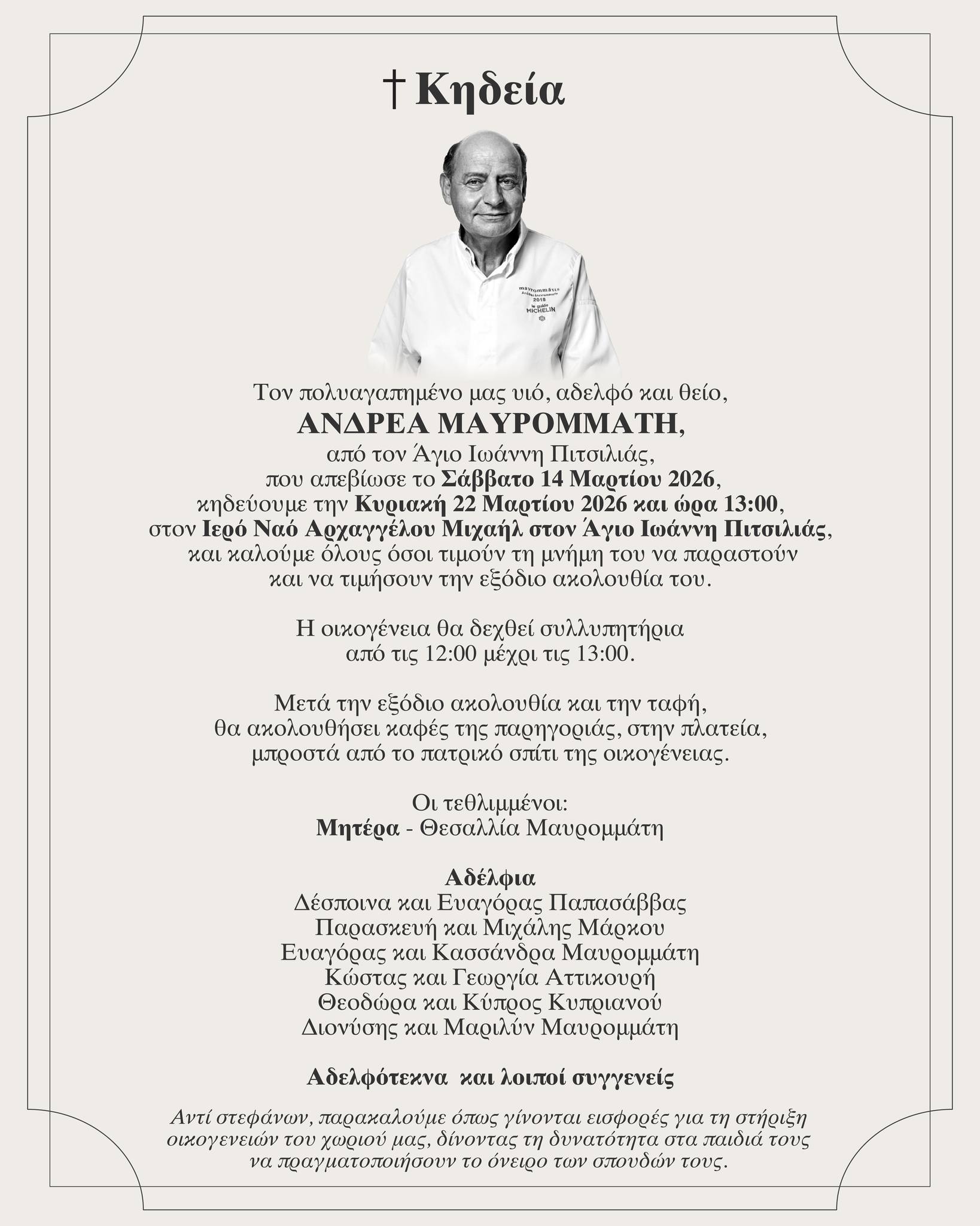 Τον πολυαγαπημένο μας υιό, αδελφό και θείο, ΑΝΔΡΕΑ ΜΑΥΡΟΜΜΑΤΗ, από τον Άγιο Ιωάννη Πιτσιλιάς, που απεβίωσε το Σάββατο 14 Μαρτίου 2026, κηδεύουμε την Κυριακή 22 Μαρτίου 2026 και ώρα 1:00 μ.μ., στον Ιερό Ναό Αρχαγγέλου Μιχαήλ στον Άγιο Ιωάννη Πιτσιλιάς, και καλούμε όλους όσοι τιμούν τη μνήμη του να παραστούν και να τιμήσουν την εξόδιο ακολουθία του.