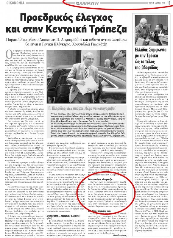 Επισημαίνεται ότι στις 11 Μαρτίου 2014 είχε ανακοινωθεί επίσημα από το Προεδρικό η απόφαση για διορισμό της Χρυστάλλας Γιωρκάτζη στη θέση της Διοικήτριας της Κεντρικής Τράπεζας, μετά την απομάκρυνση του Πανικου Δημητριάδη.