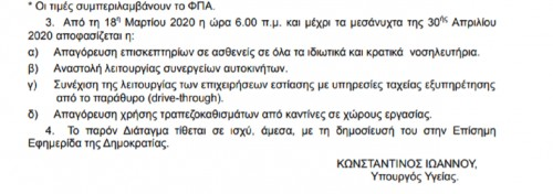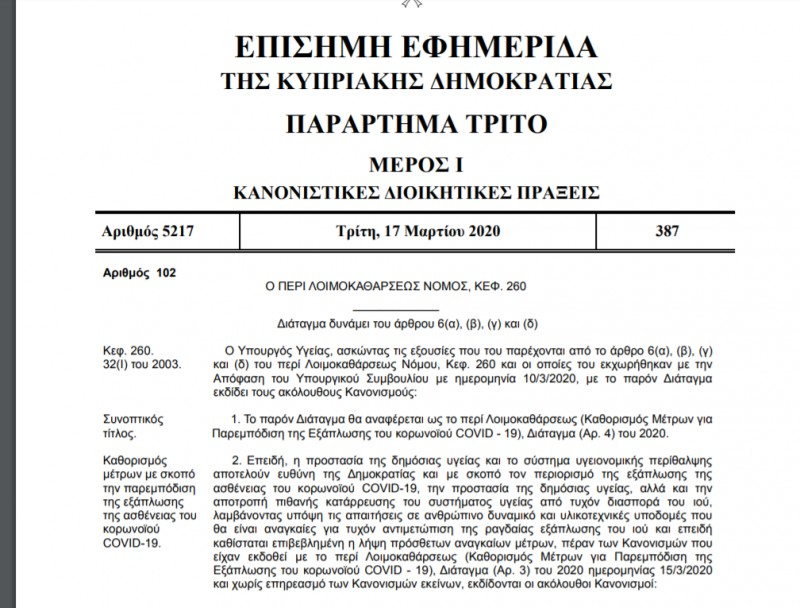 Αυτό είναι το σημερινό Διάταγμα που έχει εκδώσει ο Υπουργός Υγείας και έχει δημοσιευτεί στην Επίσημη Εφημερίδα της Δημοκρατίας.