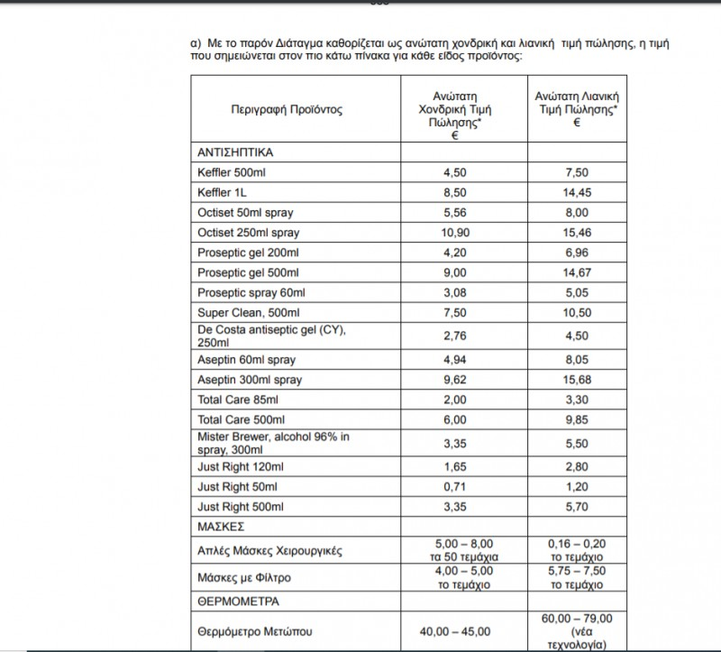 Στο Διάταγμα αναφέρεται αναλυτικά στην ανώτατη τιμή πώλησης χονδρικής και λιανικής σε αντισηπτικά, μάσκες και θερμόμετρα λόγω της ζήτησης που επικρατεί λόγω κορωνοιού.