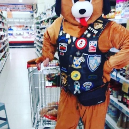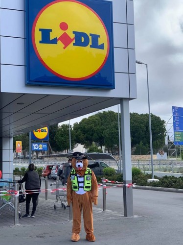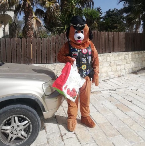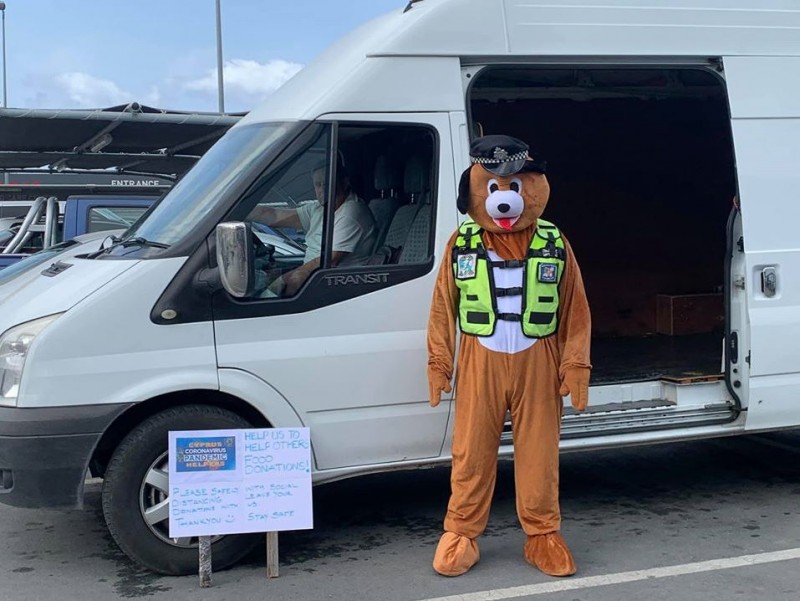 Η ομάδα έχει και την δική της μασκότ τον «PC Dog CV19» που χαρίζει χαμόγελα καθώς βοηθά σε αυτές τις δύσκολες ώρες. Στην φωτογραφία, ο εθελοντής Paul Carter καθώς αγοράζει τρόφιμα και φάρμακα για άτομα που χρειάζονται βοήθεια στο χωριό Κάθηκας.